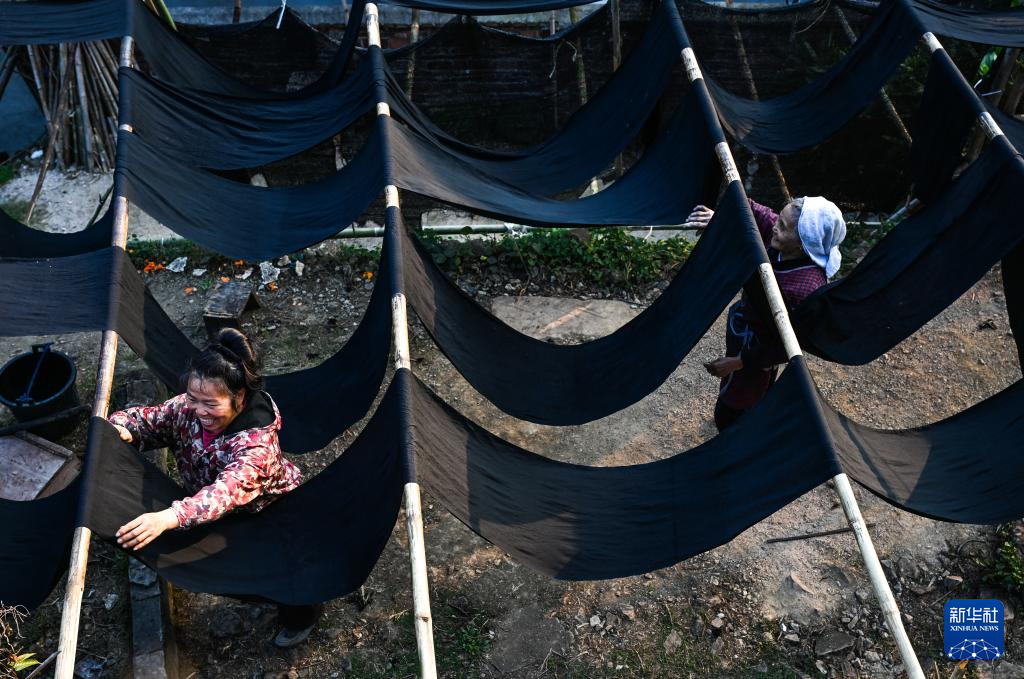 贵州省黎平县肇兴侗寨的村民在晾晒侗布(12月19日摄)。