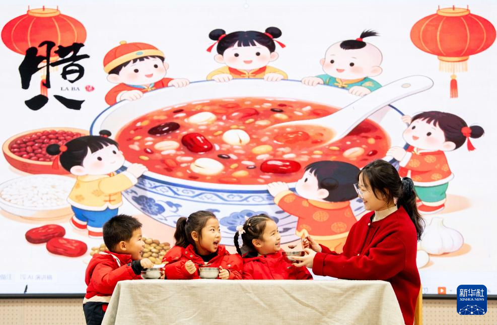 1月26日,在江苏苏州工业园区东兴路幼儿园,老师为小朋友盛腊八粥。
