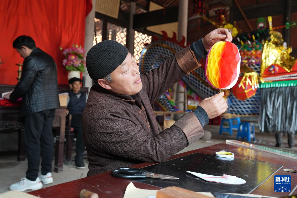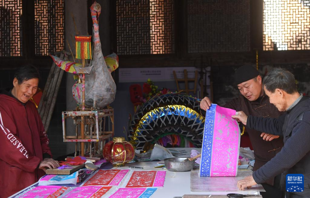 2月4日,在安华镇丰江周村的宗祠,村民在制作板凳龙花灯上的剪纸装饰。