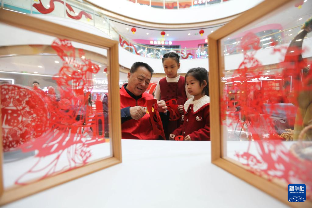 2月4日,剪纸手艺人在甘肃省定西市一商场教小朋友剪纸技艺。