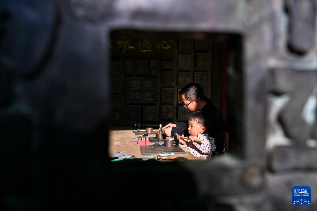 3月25日,在会泽县国家级非遗斑铜制作技艺传习馆,张氏斑铜第十三代传人张伟在教儿子敲打铜器。传习馆开设在会泽古城江西会馆内,江西会馆又称万寿宫,始建于清康熙年间。