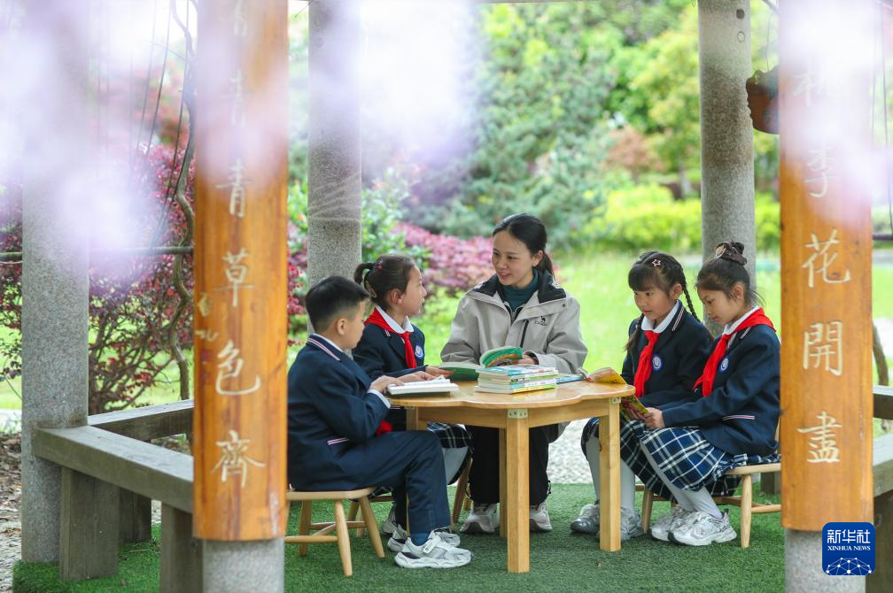 4月21日,在江苏省泰州市姜堰区实验小学教育集团城南校区,老师和学生一起阅读。