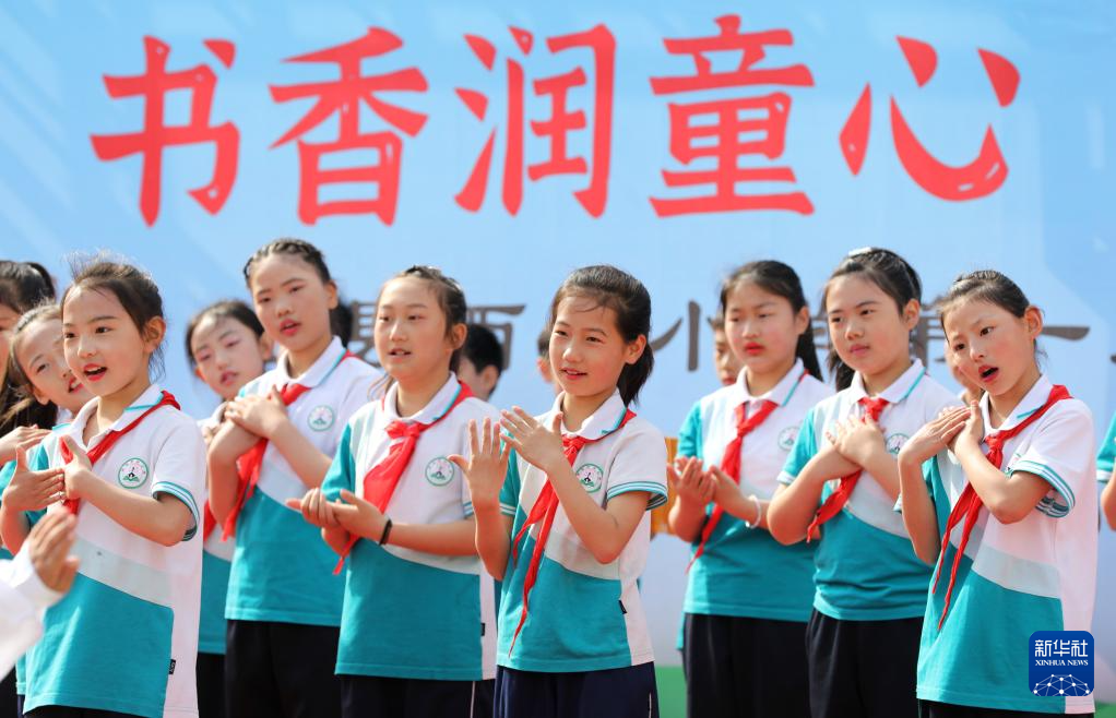 4月21日,学生在江苏省泰兴市新时代文明实践中心广场表演童声合唱《书香里的中国》。