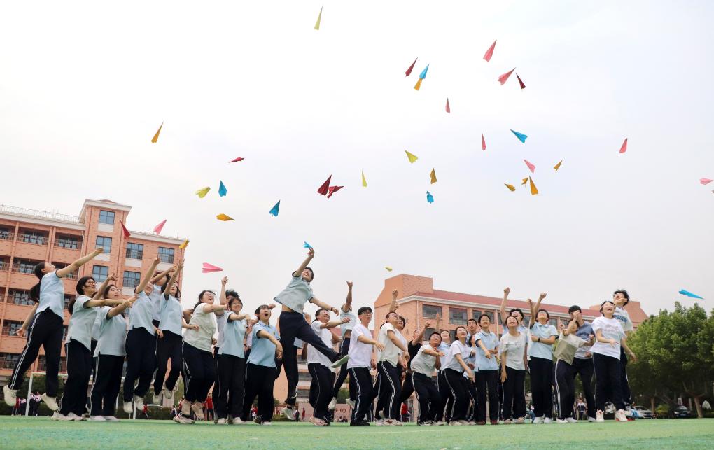 5月22日,在山东省高密市第五中学,高三学生将写有梦想的纸飞机抛向空中。高考临近,各地学校组织高三学生开展不同形式的减压活动,帮助学生放松心情,迎接高考。新华社发(李海涛摄)