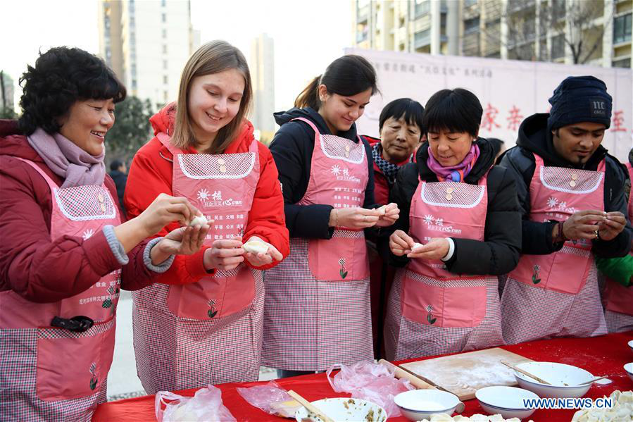 Foreign students make dumplings with residents at the Zhuxi Community of the Changqing Sub-district in Hefei, capital of east China's Anhui Province, Dec. 20, 2017. An activity on Wednesday was held in the Zhuxi Community to invite foreign students in the community to make dumplings and experience Chinese folk customs ahead of the winter solstice day, or the Dongzhi Festival. (Xinhua/Liu Junxi)