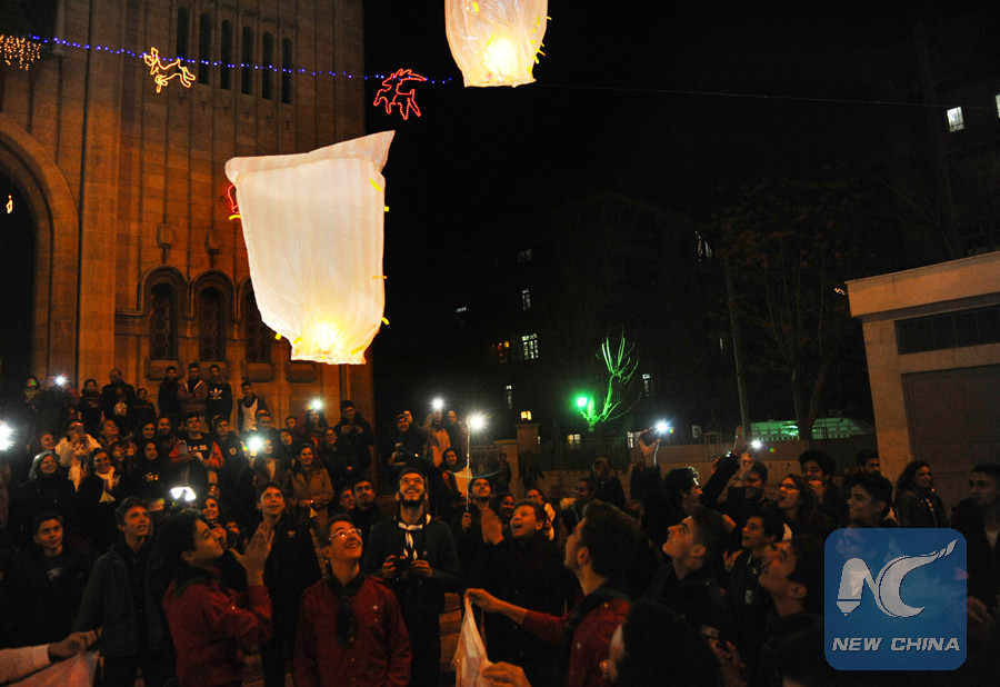 Church volunteers release wishes' sky lanterns during a Christmas celebration in the San Gorgeous church in Aleppo city, northern Syria, on Dec.22, 2017. (Xinhua/Ammar Safarjalani)