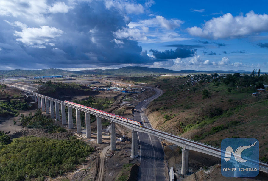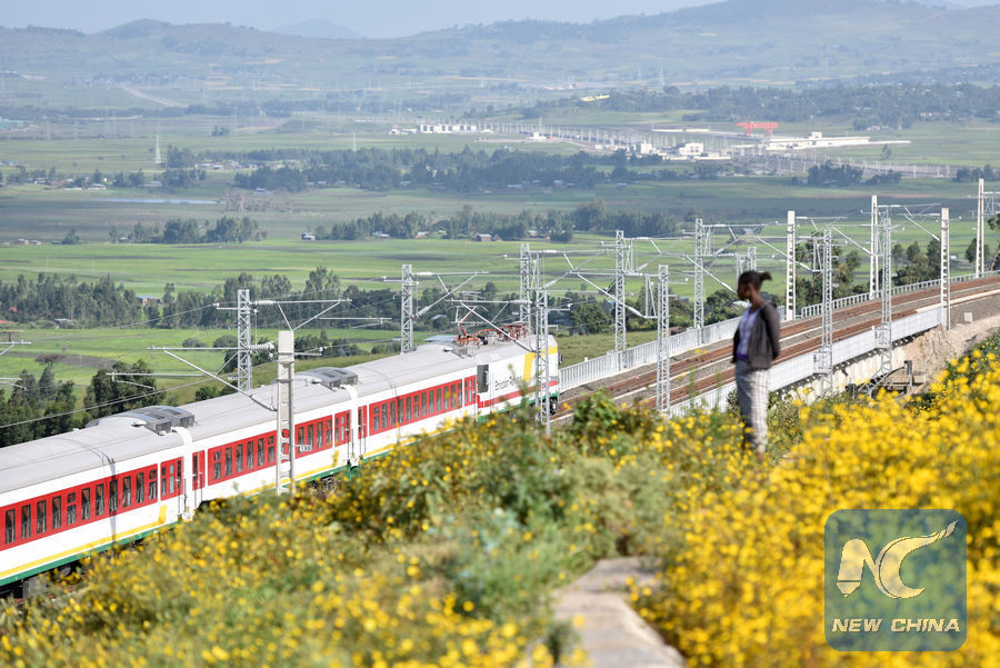 A train runs on the Ethiopia-Djibouti railway during an operational test near Addis Ababa, Ethiopia, on Oct. 3, 2016. The railway will help landlocked Ethiopia improve access to the sea and speed up a burgeoning industrialization process. The 752.7 km railway, with a designed speed of 120 km per hour, took six years to complete. It was constructed by the China Railway Group and the China Civil Engineering Construction Corporation, with a total investment of 4 billion U.S. dollars. (Xinhua/Sun Ruibo)