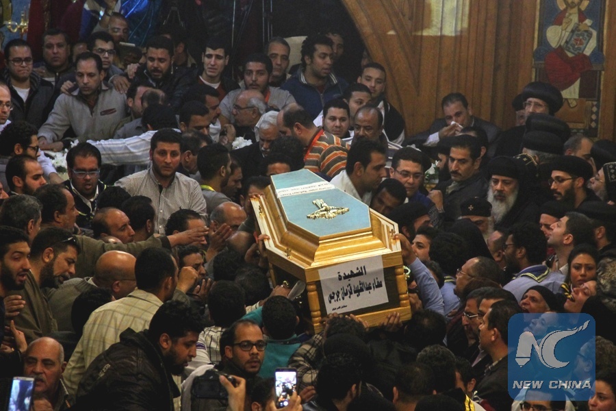 People carry a coffin of a church attack victim during a funeral in Cairo, Egypt, on Dec. 29, 2017. At least ten people were killed in a shootout outside Mar Mina church in Cairo district of Helwan on Friday. (Xinhua/Aly Fahim)