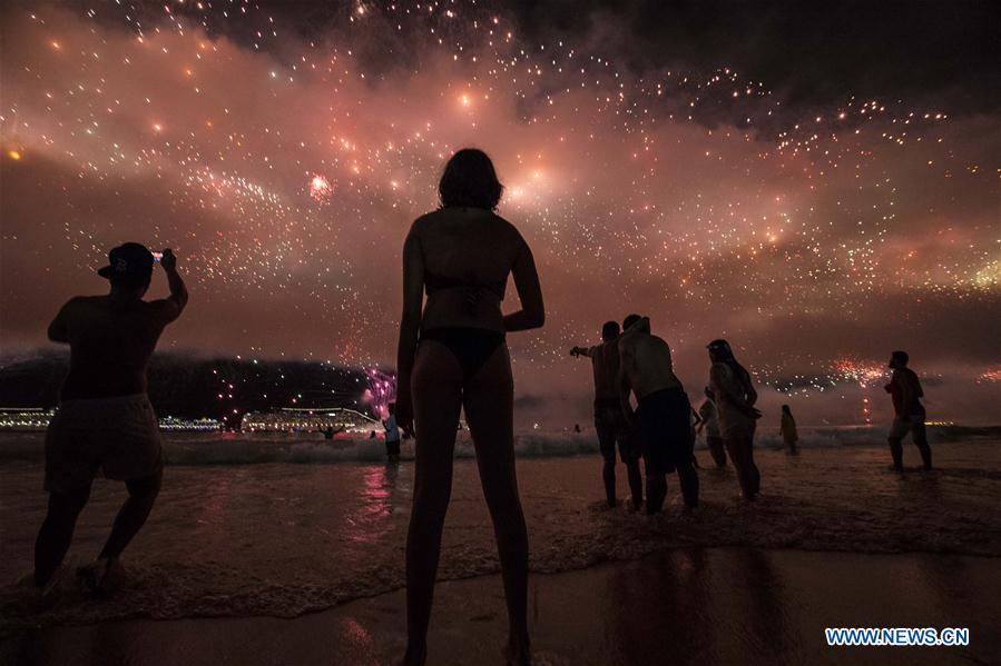 People watch fireworks celebrating the New Year in Rio De Janeiro, Brazil, Jan. 1, 2018. (Xinhua/Li Ming)