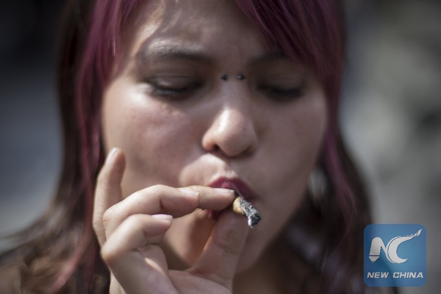 File Photo: A woman smokes marijuana during a demonstration in front of the National Supreme Court of Justice in Mexico City, capital of Mexico, on Nov. 4, 2015. (Xinhua/Alejandro Ayala)
