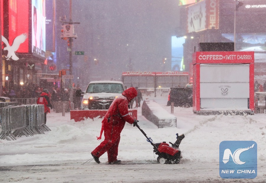 A worker clears snow at Times Square in New York, the United States, Jan. 4, 2018. New York State Governor Andrew Cuomo has declared state of emergency for the entire downstate region on Thursday as a snow storm continued to pound the U.S. East Coast. (Xinhua/Wang Ying)