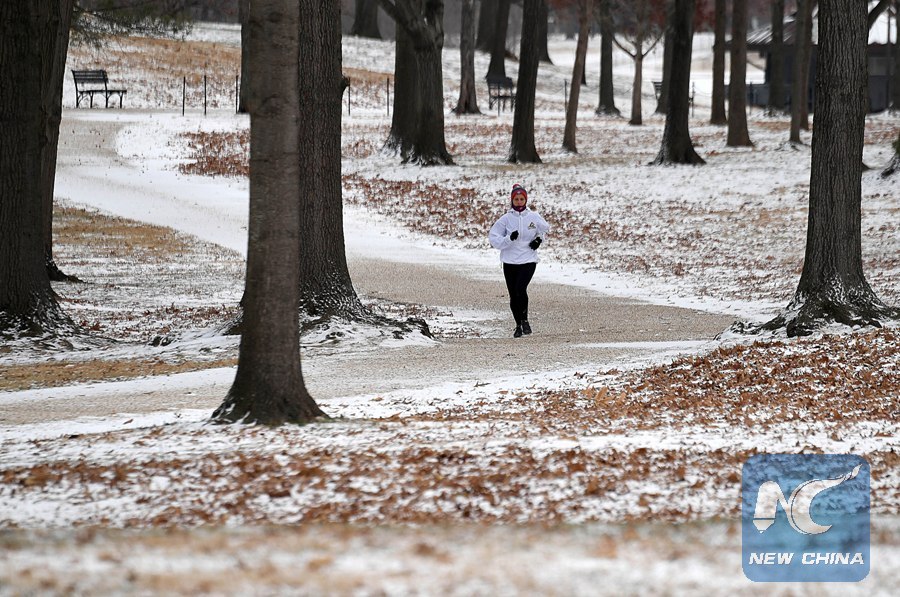 A woman runs among cold weather in Washington D.C., the United States, on Jan. 4, 2018. At least 11 people in the United States have died in link with severe cold since Tuesday morning, officials said Wednesday. (Xinhua/Yin Bogu)