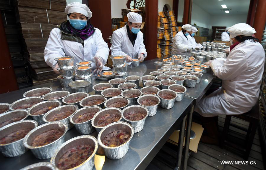 Volunteers pack laba porridge, a kind of rice porridge with nuts and dried fruit eaten on the eighth day of the twelfth lunar month which falls on the Jan. 5 next year, at Lingyin Temple in Hangzhou, east China's Zhejiang Province, Dec. 30, 2016. Linyin Temple were busy in preparing laba porridge which would be distributed to citizens and tourists for free at the temple and to some hospitals, nursing homes, welfare houses and migrant schools etc.. (Xinhua/Wang Dingchang)