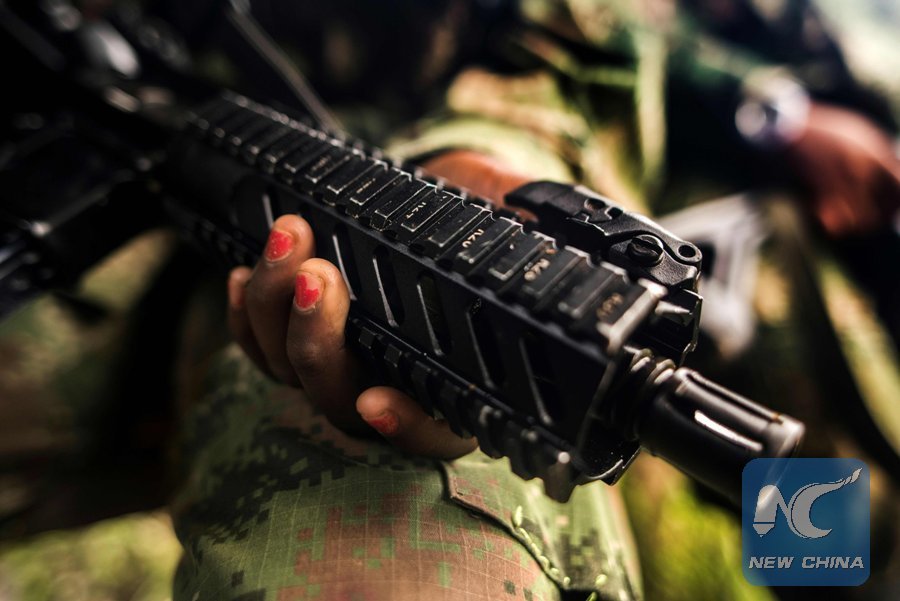 File photo taken on Nov. 20, 2017 shows a member of the "Omar Gomez" Western War Front of the National Liberation Army (ELN) guerrilla holding her gun in a camp on the banks of the San Juan River, Choco department, Colombia. (Xinhua/AFP)