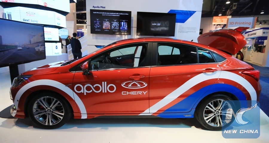 Photo taken on Jan. 11, 2018 shows Chery's ARRIZO 5 self-driving vehicle installed with Baidu Apollo Pilot 2.0 at Consumer Electronics Show (CES) in Las Vegas, the United States. (Xinhua/Li Ying)