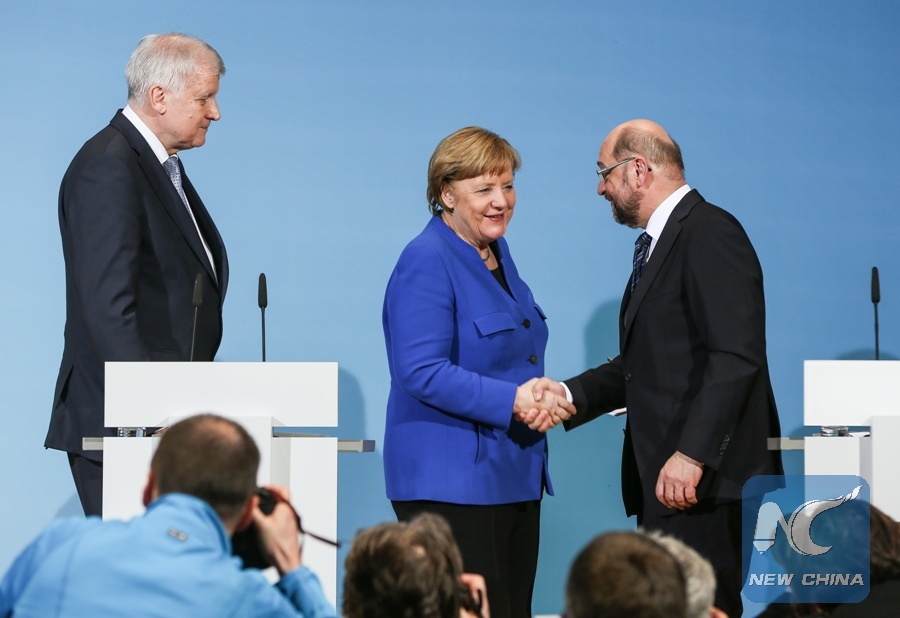 BERLIN, Jan. 17 (Xinhua) -- German Chancellor Angela Merkel (CDU) on Wednesday ruled out further political concessions in the preliminary coalition agreement between the Christian Democratic Union (CDU), Christian Social Union (CSU) and German Social Democrats (SPD).