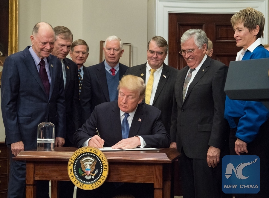 Photo released by NASA on Dec. 11, 2017 shows U.S. President Donald Trump (front) signing the Space Policy Directive 1 at the White House in Washington D.C., the United States, on Dec. 11, 2017. Donald Trump signed his administration's first space policy directive, formally directing the U.S. space agency NASA to send astronauts back to the moon and eventually Mars. (Xinhua/NASA/Aubrey Gemignani)