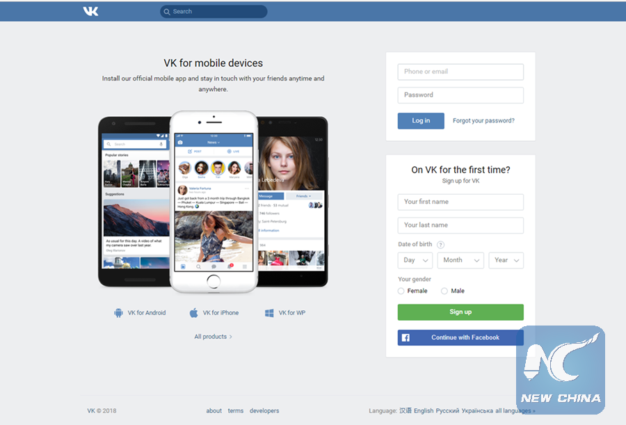 Screenshot taken on January 19, 2018 shows the home page of the Russian social network VKontakte. (Xinhua/Liao Bingqing)