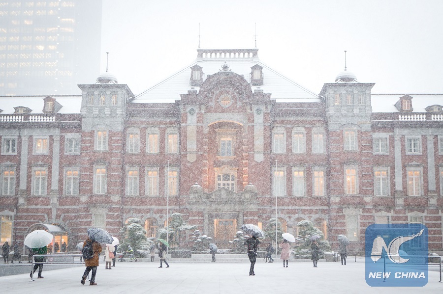 People walk in snow in front of Tokyo Station in Tokyo, Japan, Jan. 22, 2018. (Xinhua/Ma Caoran)