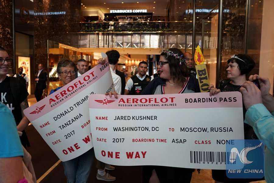 A group of protesters are stopped by secret service officers as they try to deliver a made up one way plane ticket to Russia for U.S. President Donald Trump and his family members at the Trump Tower during a demonstration to mark his birthday, in New York on June 14, 2017. (Xinhua/AFP)