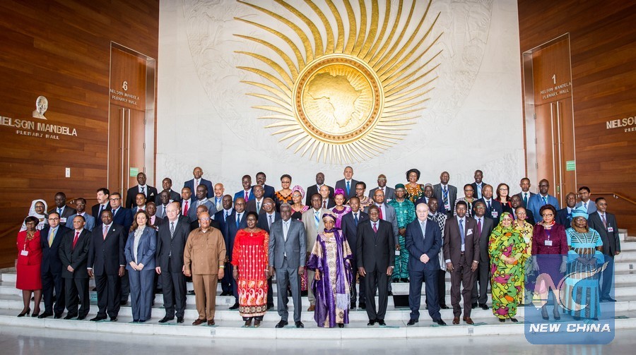 Participants pose for a group photo after the 35th ordinary session of the AU Permanent Representatives Committee at the headquarters of the pan-African bloc in Ethiopia's capital Addis Ababa, Jan. 22, 2018. (Xinhua/Lyu Shuai)