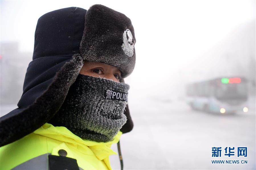 A policeman directs traffic on a main road in Mohe County, northeast China’s Heilongjiang Province, Jan. 24, 2018. Mohe County recorded minus 40 degrees Celsius on Jan. 24, 2018. (Xinhua/Wang Kai)