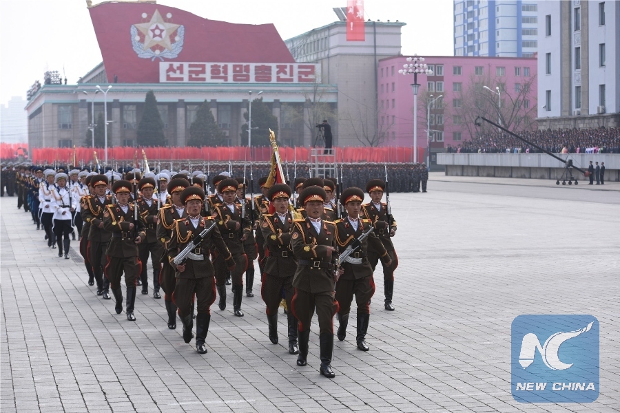 Soldiers attend a military parade in central Pyongyang, April 15, 2017. (Xinhua/Cheng Dayu)