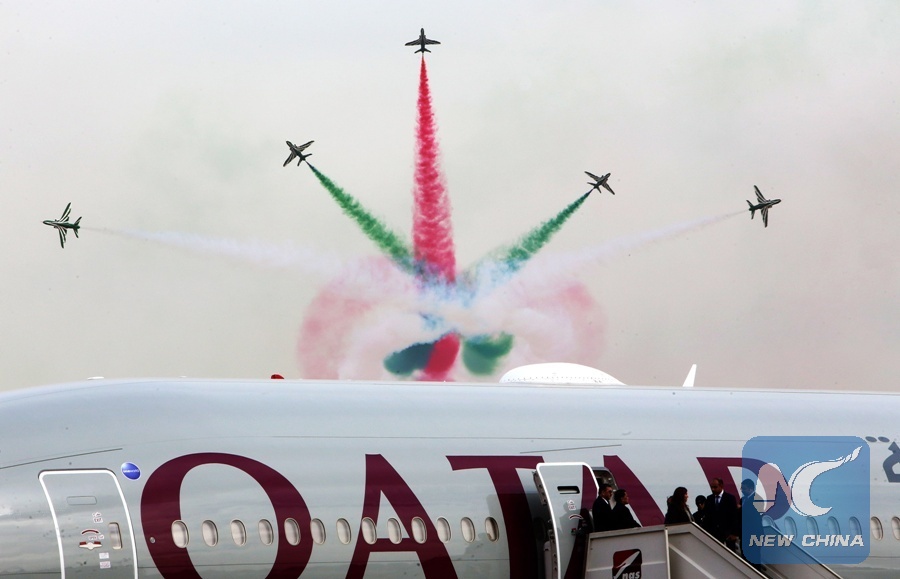 A Qatar Airways plane is seen on the tarmac as Saudi falcon Hawk Mk 65 aircrafts perform during the Kuwait aviation show in Kuwait City on January 17, 2018. (Xinhua/AFP)