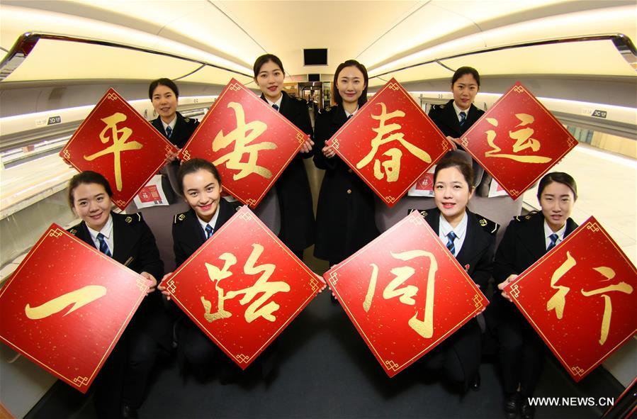 Staff members of Jinan West Railway Station pose for photos at a bullet train on Jan. 31, 2018. About 2.98 billion trips are expected to be made during the 2018 Spring Festival travel rush, known as the Chunyun, between February 1 and March 12, Lian Weiliang, deputy head of the National Development and Reform Commission (NDRC) told a press conference. (Xinhua/Tang Ke)
