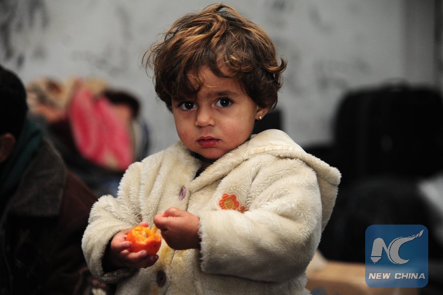 A girl eats fruit at the Jibreen temporary shelter, south of Aleppo, Syria, on Dec. 19, 2016. Hundreds of people were evacuated from Kafraya and Foa, two Shiite towns besieged by the rebels in the northwestern province of Idlib, to Jibreen. (Xinhua/Ammar Safarjalani)