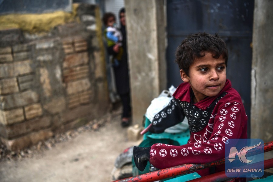 A Syrian refugee boy stays next to his home at a refugee camp on Jan. 26, 2018 at the Syrian town of Azaz. (Xinhua/AFP)