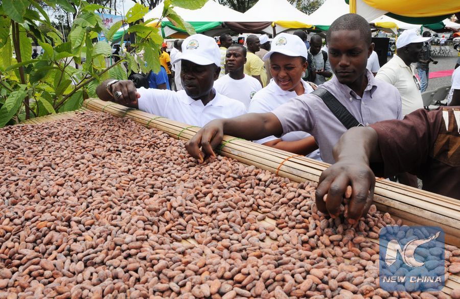 Visitors view cocoa beans at an exhibition stand during the Ghana Cocoa Festival in Accra, capital of Ghana, on Sept. 28, 2013. (Xinhua/Seth Gafah)