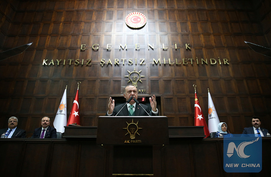 Turkish President Recep Tayyip Erdogan addresses members of parliament from his ruling AK Party (AKP) during a meeting at the Turkish parliament in Ankara, Turkey, February 6, 2018. (Presidential Palace/Handout via REUTERS)