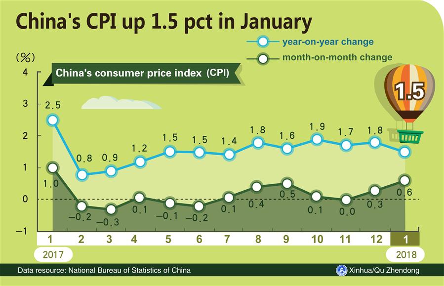 Graphics shows that China's consumer price index (CPI) rose 1.5 percent year on year in January. (Xinhua/Qu Zhendong)