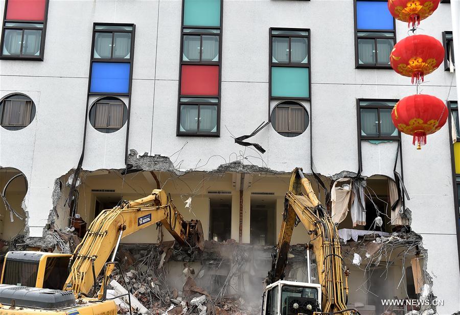 Large machines clear the site of the collapsed Marshal Hotel in Hualien County, southeast China's Taiwan, Feb. 9, 2018. Large machinery started to clear the site of the collapsed Marshal Hotel and two tilted buildings on Friday morning. Rescuers Friday were continuing their search for seven people trapped in a collapsed building about 60 hours after a powerful earthquake struck Hualien. (Xinhua/Yue Yuewei)