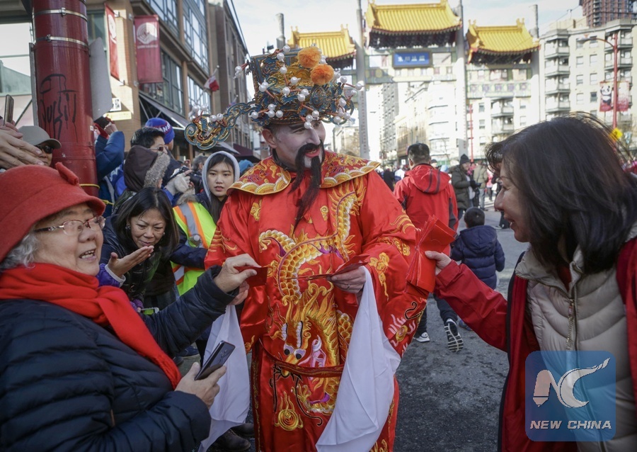 A performer dressed up as "Money God" distributes "red pockets" during the 45th Chinese New Year Parade in Vancouver, Canada, on Feb. 18, 2018. Thousands of participants paraded along the streets in Vancouver's Chinatown Sunday to celebrate the Year of the Dog, attracting over 100,000 spectators. (Xinhua/Liang Sen)