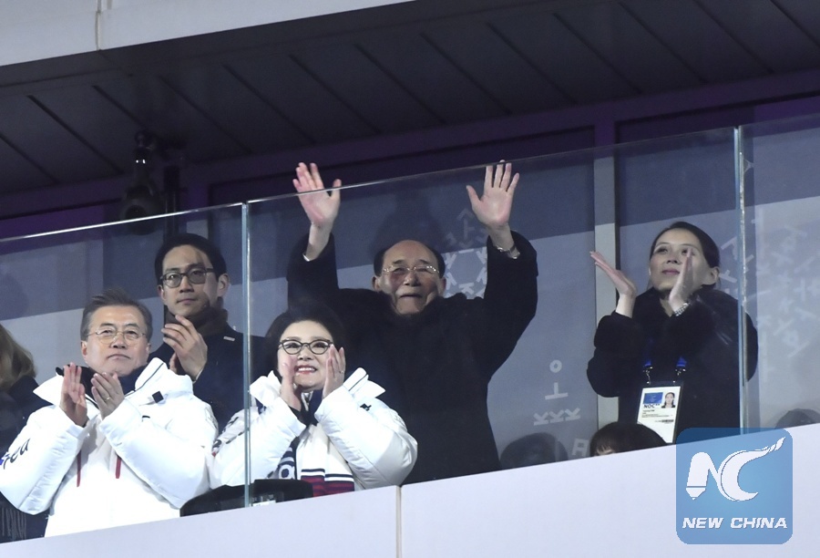 Kim Yong Nam (2nd R), president of the Presidium of the DPRK Supreme People's Assembly and Kim Yo Jong (1st R), the younger sister of DPRK's top leader Kim Jong Un react during the opening ceremony of the 2018 PyeongChang Winter Olympic Games at PyeongChang Olympic Stadium in PyeongChang, South Korea, Feb. 9, 2018. (Xinhua/Lui Siu Wai)