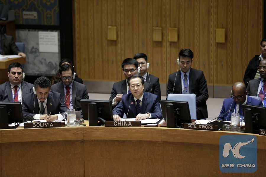 China's Permanent Representative to the United Nations Ma Zhaoxu (C, Front) addresses a United Nations Security Council meeting on the situation in Syria at the UN headquarters in New York, on Feb. 22, 2018. (Xinhua/Li Muzi)