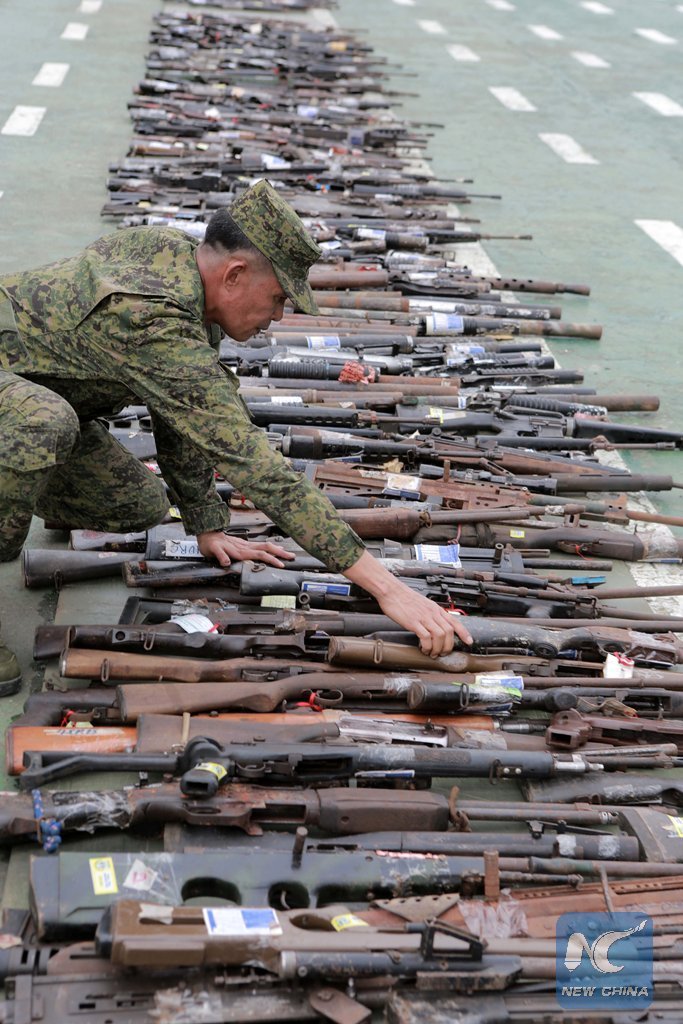 A soldier arranges the confiscated weapons used by pro-Islamic State militant groups at the Fort Bonifacio in Taguig City, the Philippines, Dec. 13, 2017. Hundreds of weapons from pro-Islamic State militant groups were gathered and destroyed by the government. (Xinhua/Rouelle Umali)