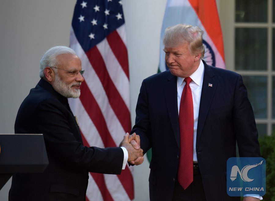 U.S. President Donald Trump (R) and Indian Prime Minister Narendra Modi shake hands after giving joint statements at the White House in Washington D.C., the United States, June 26, 2017. (Xinhua/Yin Bogu)