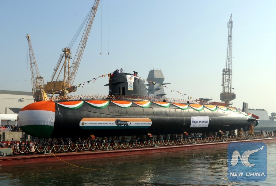 The Scorpene-class submarine "INS Karanj" is seen at the Mazagon Dock Shipbuilders Limited (MDL) in Mumbai city, India, on Jan. 31, 2018. India launched the third of its six Scorpene-class submarines, named "INS Karanj", at the Mazagon Dock Shipbuilders Limited (MDL), said Indian Navy officials. (Xinhua)