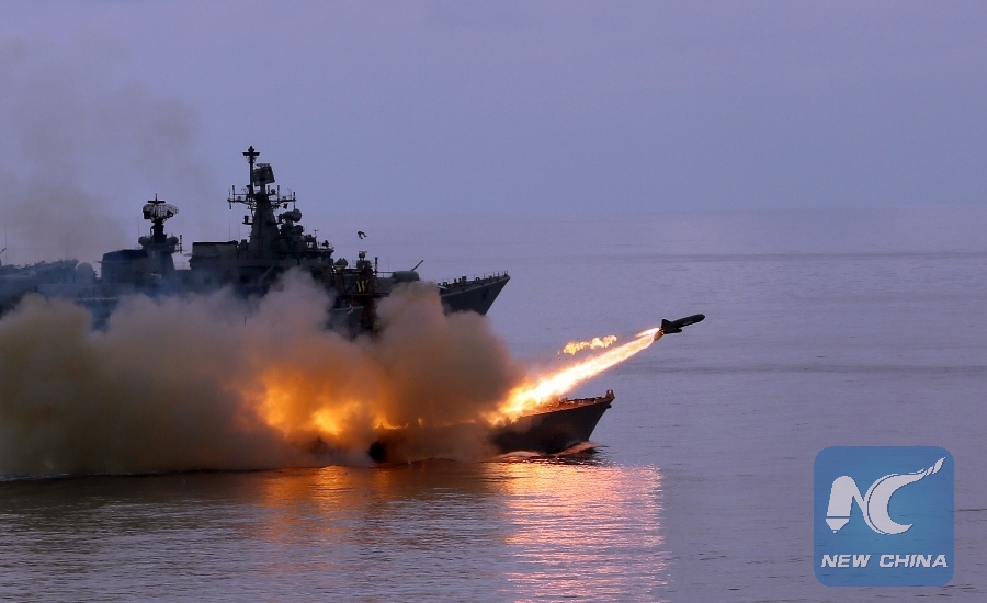 A Surface to Surface Missile (SSM) is fired by Indian missile boat INS Nirghat during the operational demonstration held about 50 kms off the Kochi coast, southwest India, Dec. 15, 2015. (Xinhua/Indian Navy)