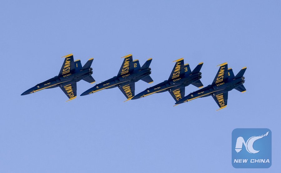 F-18 fighters of the U.S. Navy Blue Angels perform during the Breitling Huntington Beach Airshow, in Orange County, California, the United States, on Sept. 30, 2017. (Xinhua/Zhao Hanrong)