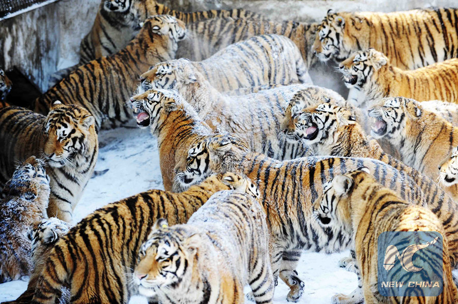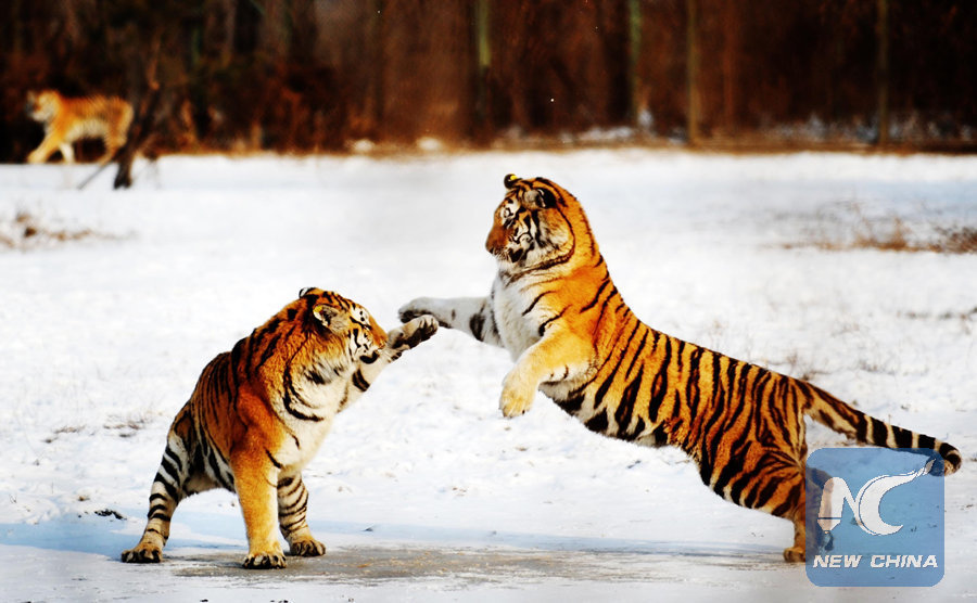 Siberian tigers play at the Siberian Tiger Park in Hengdaohezi Township of Hailin City, northeast China's Heilongjiang Province. (Xinhua/Wang Jianwei)