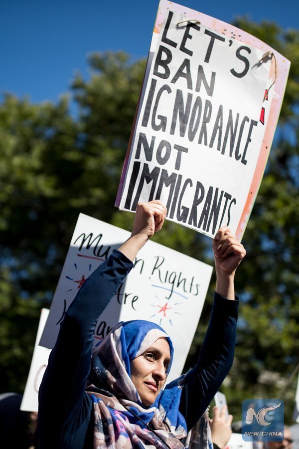 People protest against the new travel restrictions near the White House in Washington D.C., the United States, on Oct. 18, 2017. U.S. President Donald Trump on Sept. 24 expanded a travel ban to include visitors from the Democratic People's Republic of Korea (DPRK) in East Asia, Venezuela in Latin America and Chad in central Africa. (Xinhua/Ting Shen)