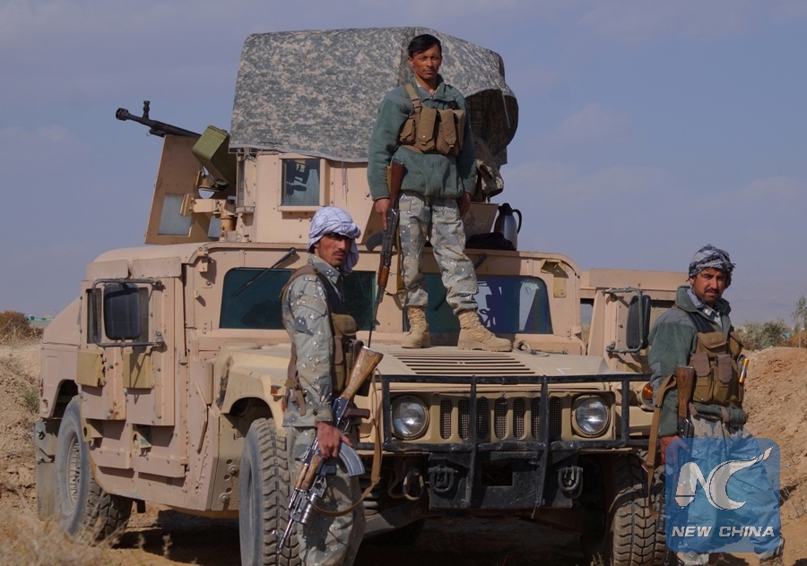 Photo taken on Oct. 28, 2017 shows Afghan security force members at the site of Talibanattack in Ghazni province, Afghanistan. Up to nine police personnel were killed as Taliban militants stormed security checkpoints in Khashik and Shahbaz neighborhoods outside Ghazni city, the capital of eastern Ghazni province, spokesman for provincial government Arif Nuri said. (Xinhua/Stringer)