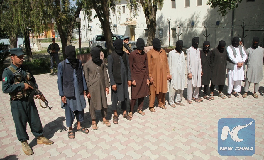 Suspected Taliban militants stand handcuffed in Jalalabad city, Nangarhar province, Afghanistan, Sept. 18, 2017. Afghan security personnel captured 13 suspected Taliban militants during an operation in Nangarhar province, a local official said. (Xinhua/Rahman Safi)
