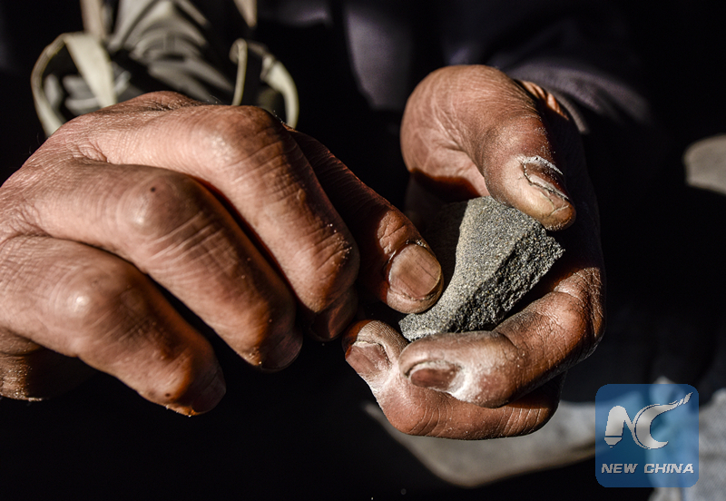 Dai sands his fingernails with a grindstone. (Xinhua/Zhao Ge)
