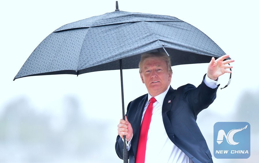 U.S. President Donald Trump waves while holding his umbrella walking under the rain on arrival in Los Angeles, California on March 13, 2018. (Xinhua/AFP)