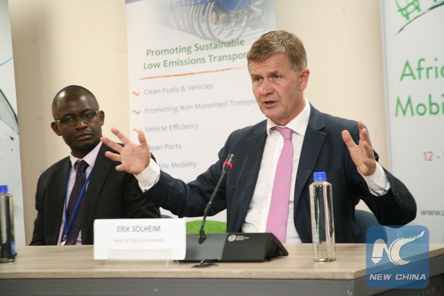 Erik Solheim (R), Head of United Nations Environment addresses journalists on the sidelines of Africa Clean Mobility Week Conference in Nairobi, capital of Kenya, March 14, 2018. (Xinhua/Charles Onyango)